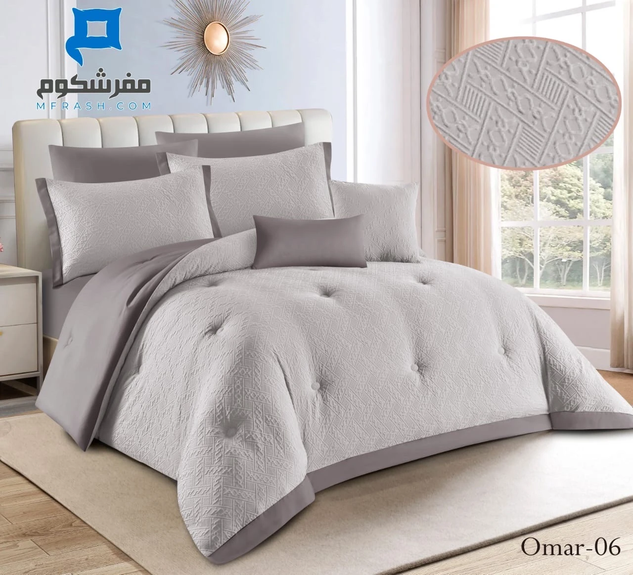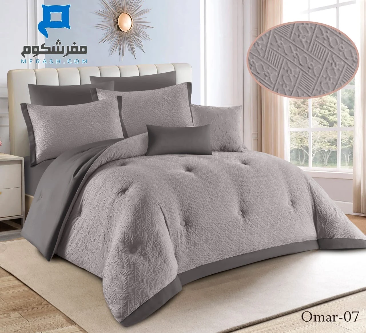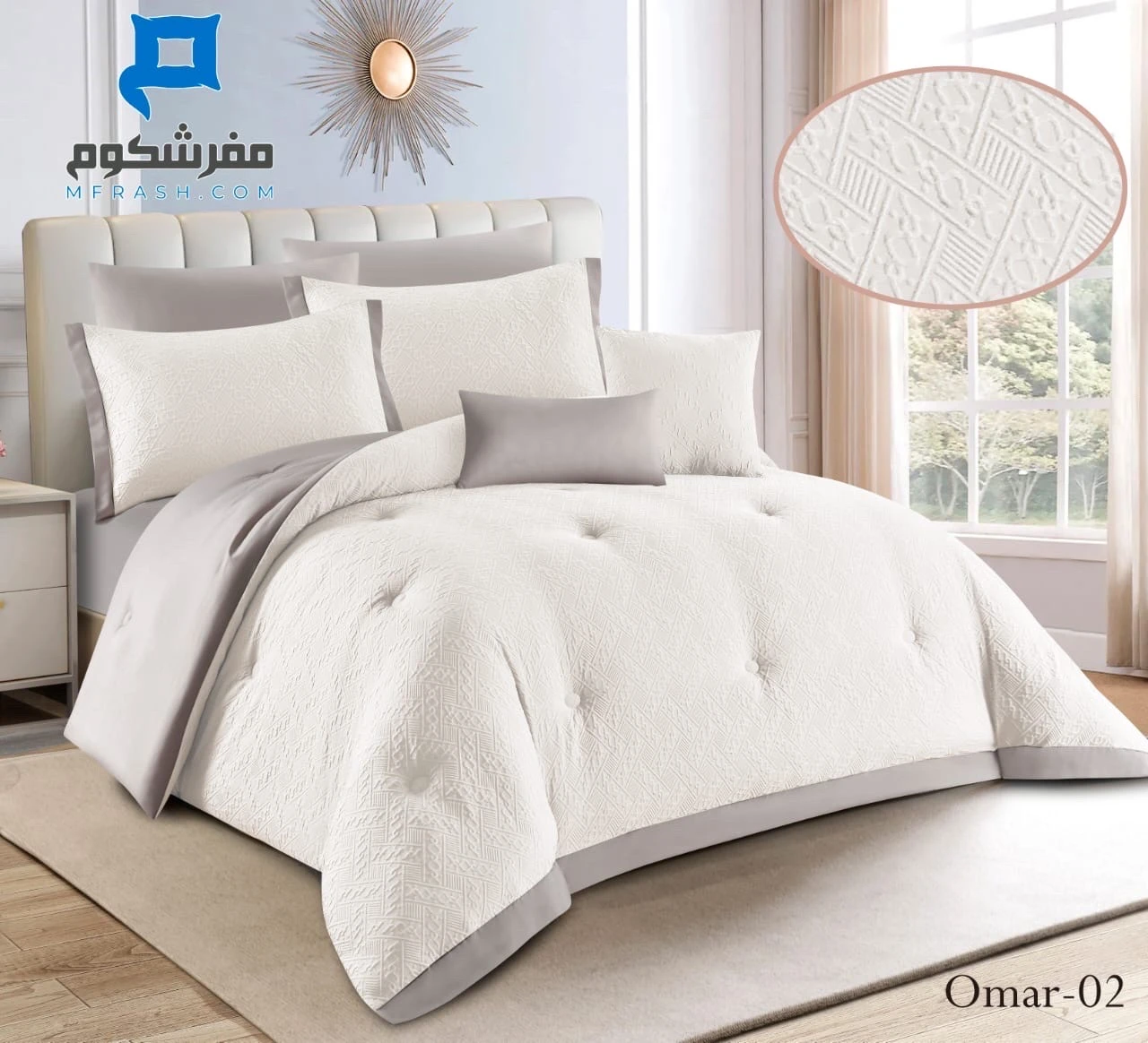 حاف نفرين 8 قطع ساده وجهين مع نقش بارز صيفي اللحاف 240x260سم شرشف 200* 200 +30سم 2 تلبيس مخده 50x75+5 2 تلبيس مخده 50x75 1 تكايه 45x45 مع الحشوه 1 تكايه 30x60 مع الحشوه