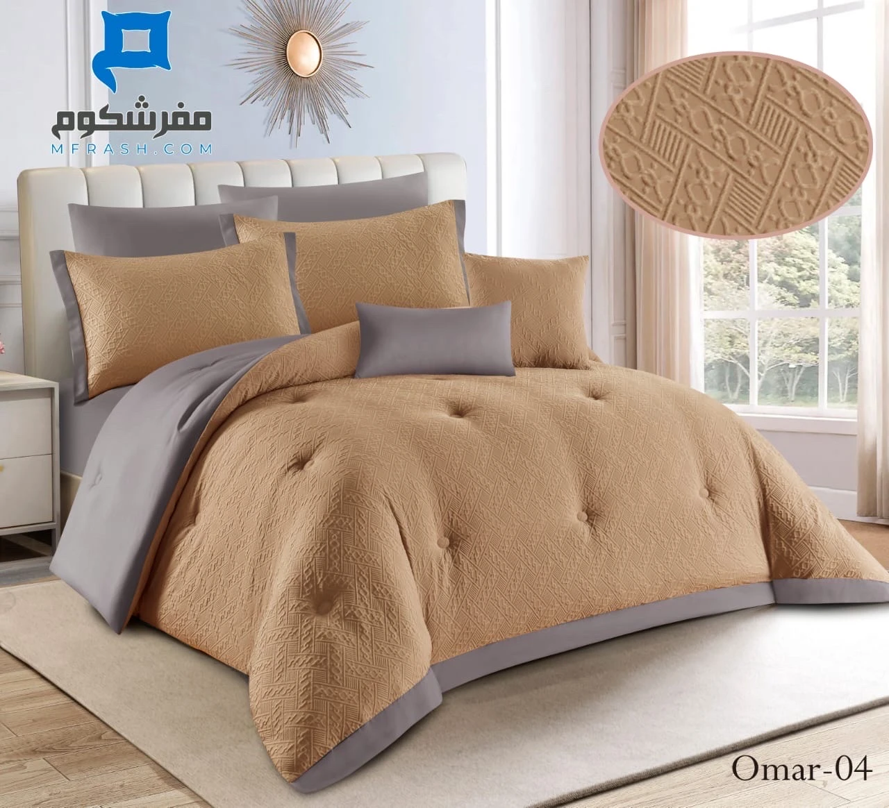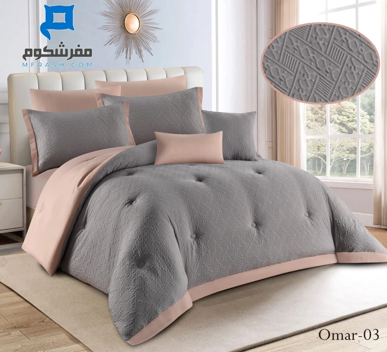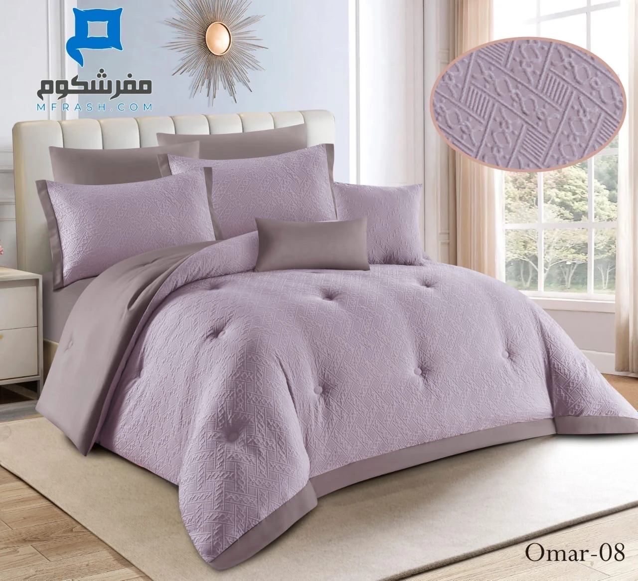 حاف نفرين 8 قطع ساده وجهين مع نقش بارز صيفي اللحاف 240x260سم شرشف 200* 200 +30سم 2 تلبيس مخده 50x75+5 2 تلبيس مخده 50x75 1 تكايه 45x45 مع الحشوه 1 تكايه 30x60 مع الحشوه