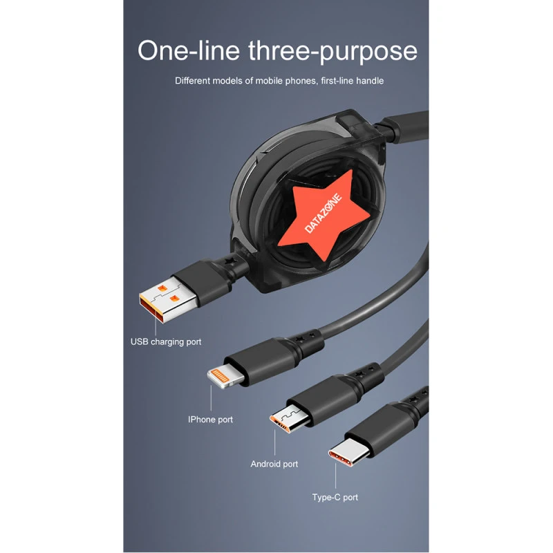 سلك شاحن 3 في 1 قابل للسحب، للأيفون والتايب سي والمايكرو الصغير لون اسود